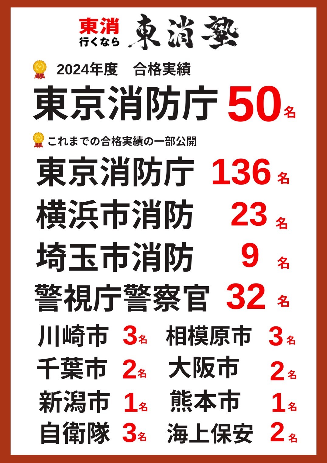 今年1年間での東京消防庁合格実績は50名ですが、過去136名の東京消防庁合格者を出しています。