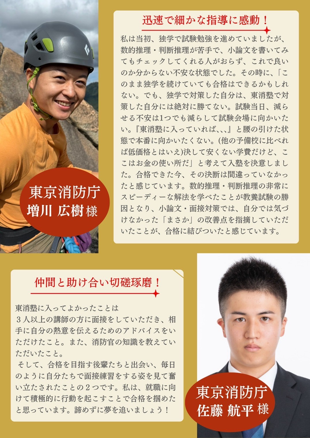 東消塾に入ってよかったと思う部分は、試験対策の部分だけではありません。サポート内容の厚さや東京消防庁OBの方との面接経験、切磋琢磨できる仲間との出会いなど様々です。