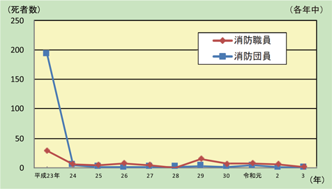 参考:資料2-3-1 消防職団員の公務による死傷者数 | 令和3年版 消防白書