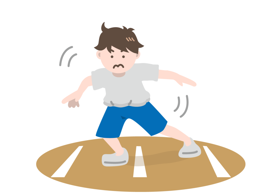 立ち幅とびは、ライン手前で足を揃え、助走を付けずに立ったままの姿勢からどれだけ前方へ跳べるのかを測る種目です。