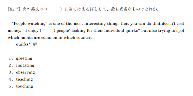 英文理解は、英文を読んで問題文と一致する回答を選んだり、虫食いになっている箇所に入る英単語を選んだりするような問題が出されます。