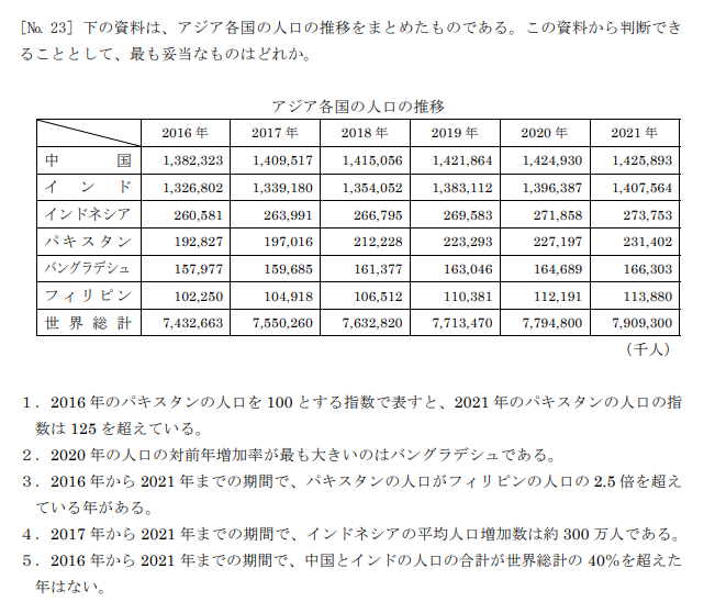 資料解釈は、表やグラフから構成比・増加率・指数などの情報を読み解き、計算を用いながら回答する問題が出されます。