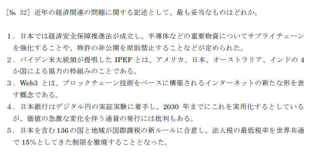 専門的な知識が問われるため難易度は高めですが、ニュース等で見覚えのある単語もよく出てくるため、ある程度勉強すれば覚えられないことはありません。